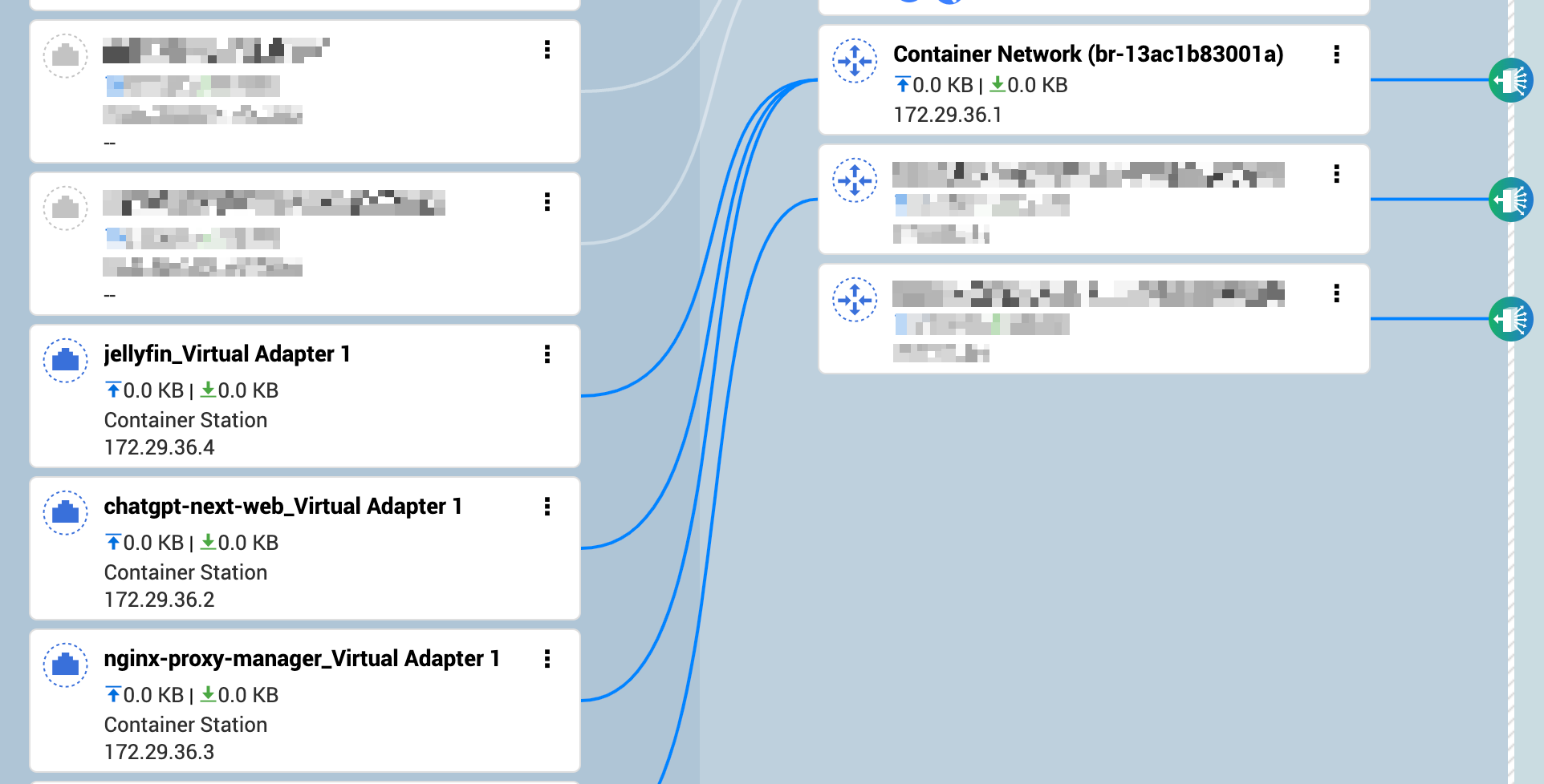 查看威联通的”网络与虚拟交换机“,发现自己通过 docker compose 方式创建的应用,都分别使用了独立的虚拟交换机并且网段不同;而如果通过 Container Station UI 创建的 docker 应用,则都会默认连接到名为 lxcbr0 的同一个虚拟交换机中,可以互相通信。因此只需将 docker compose 创建的应用,接入同一个网络中即可。