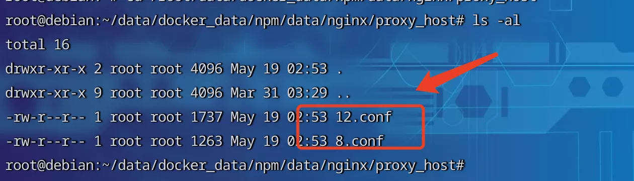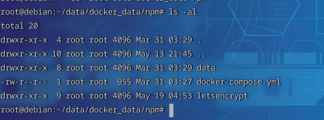 登陆服务器,来到NPM的安装路径下(这边假设大家都是用【Docker系列】一个反向代理神器——Nginx Proxy Manager这篇文章的方法搭建的):