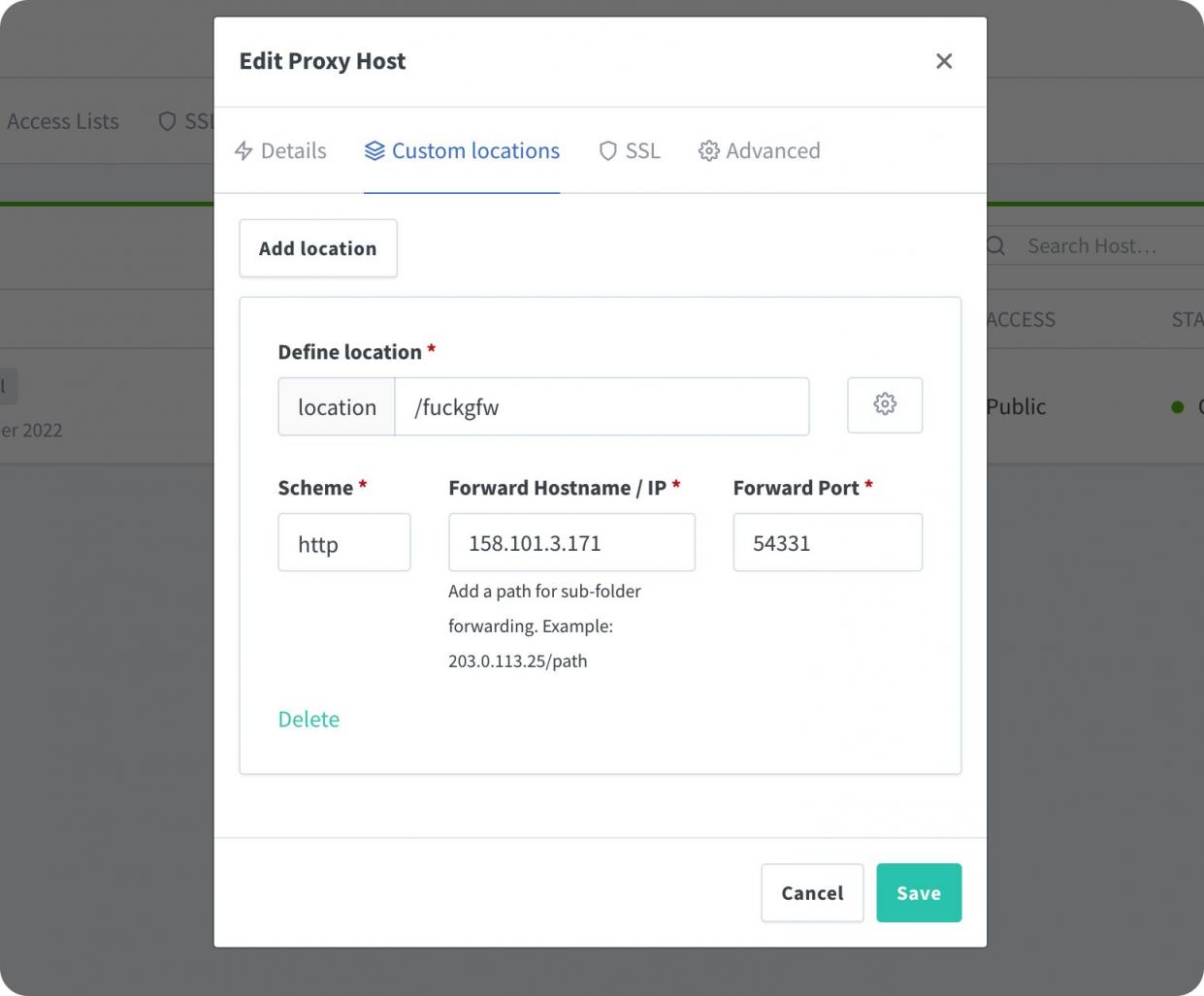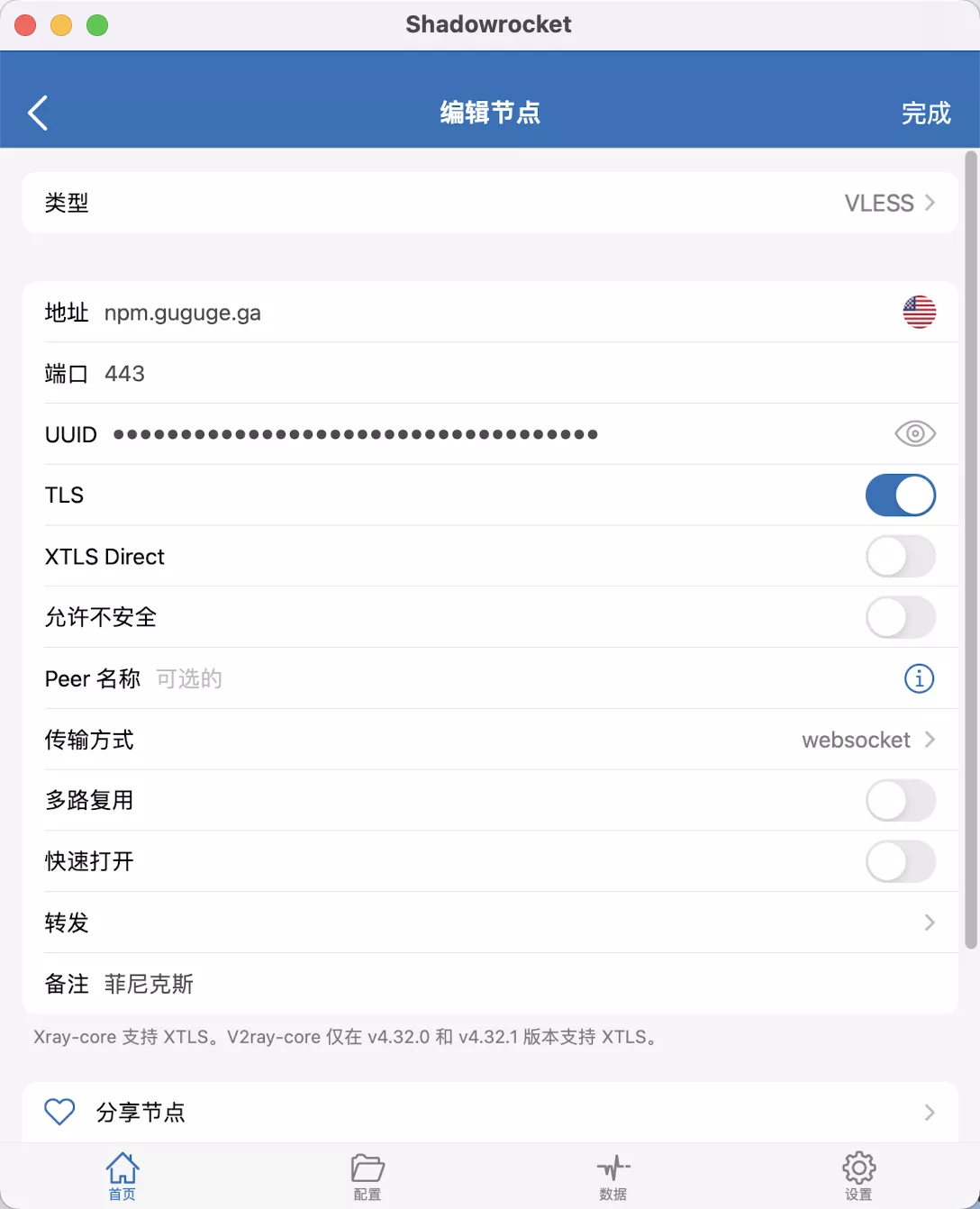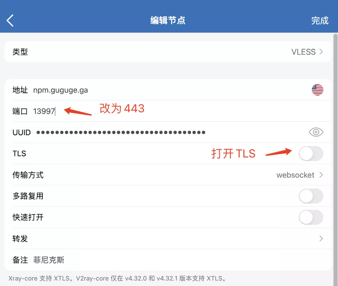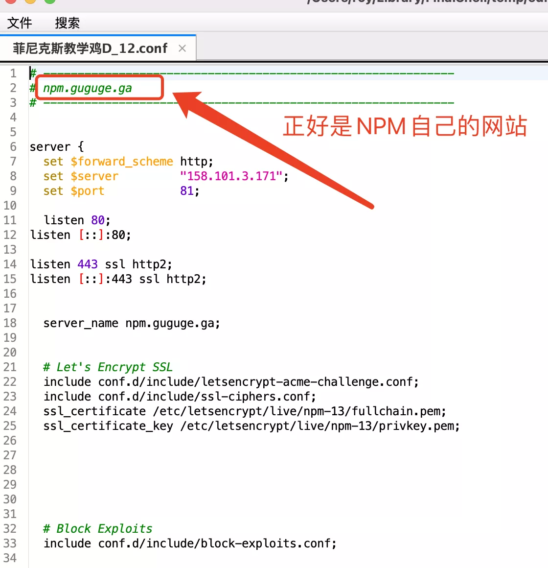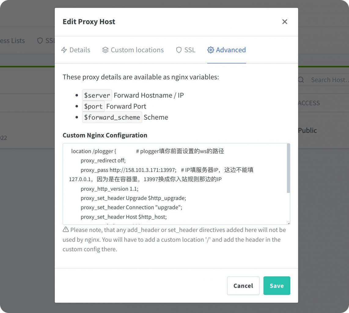 由于我们是直接修改的配置文件,所以,在反代的这个站点,不用轻易在NPM后台面板上修改原来的配置(比如打开,然后点确定),这样会破坏掉我们这边写的Nginx配置文件,导致节点无法正常使用。