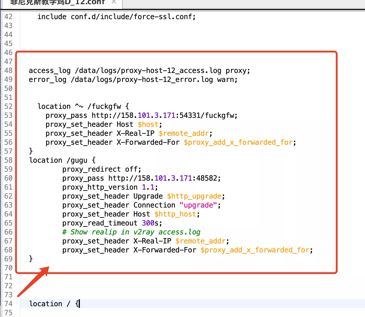 proxy_pass http://158.101.3.171:54331/fuckgfw; # IP填服务器IP,这边不能填127.0.0.1,因为是在容器里,54331换成你xui面板的端口