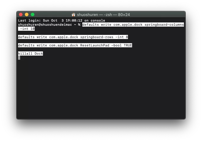 defaults write com.apple.dock springboard-rows -int 8这一行代码是用来调整多少行显示图标数量,这里的8就是代表显示8行,这个也可以根据自己喜好去调整。